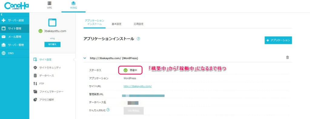 ステータスが「構築中」から「稼働中」になれば、WordPressかんたん移行は終了です。
