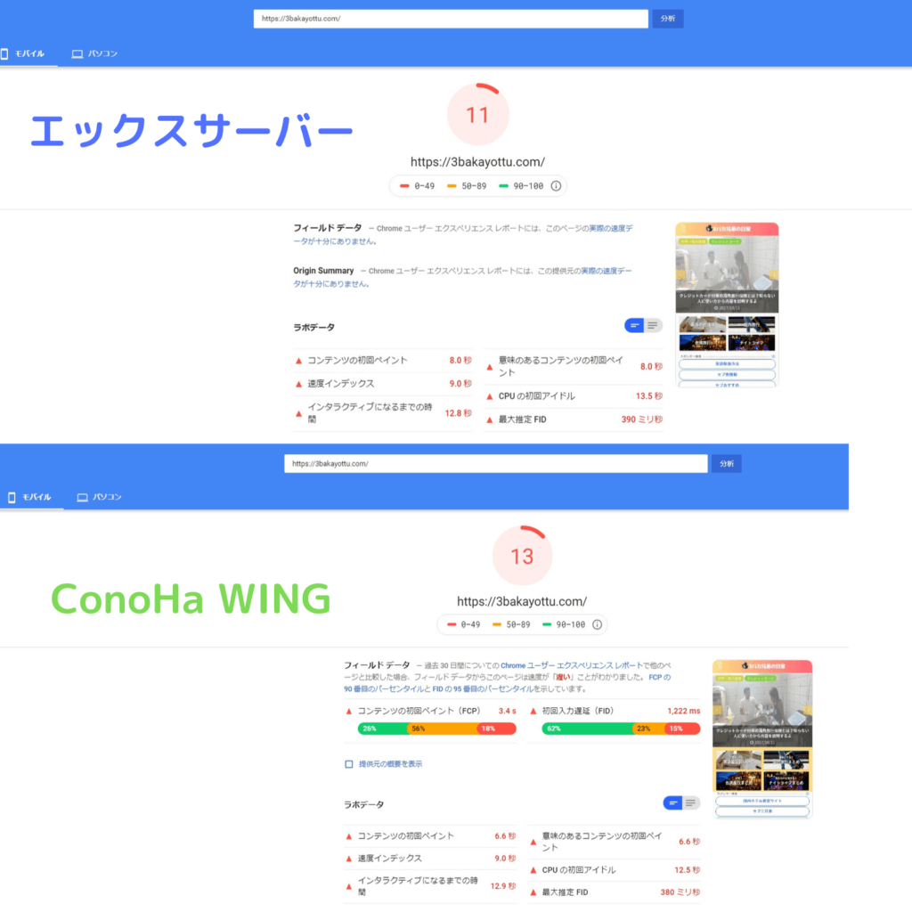 エックスサーバーのX10プランと同じ料金のConoHa WINGのベーシックプランに移行して、同時刻でPageSpeed InsightとTest My Siteで計測しています。