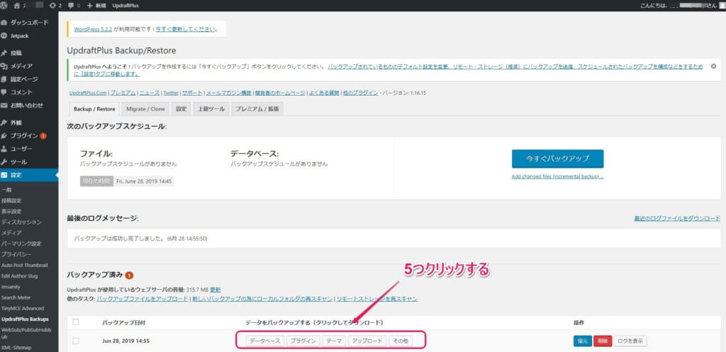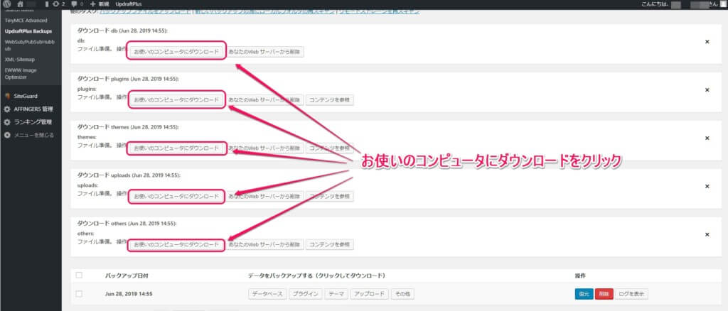 バックアップ済みの項目から、「データベース」「プラグイン」「テーマ」「アップロード」「その他」を一つずつクリックします。