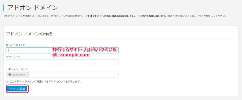 cPanelのドメインセクションにある「アドオンドメイン」をクリックして、アドオンドメインの画面で「新しいドメイン名」に移行するサイト・ブログのドメイン名を入力します。