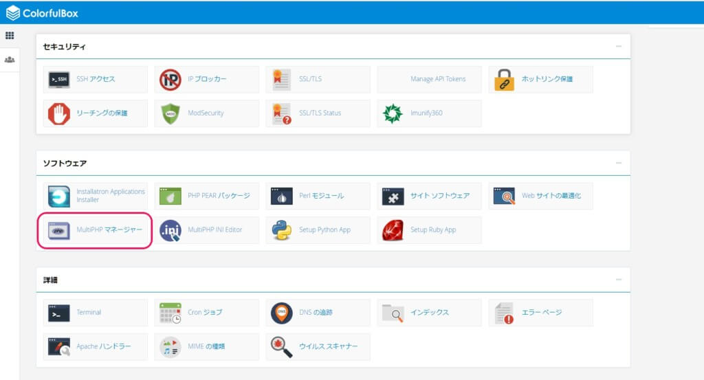 カラフルボックスの場合で説明すると、cPanelにログインします。